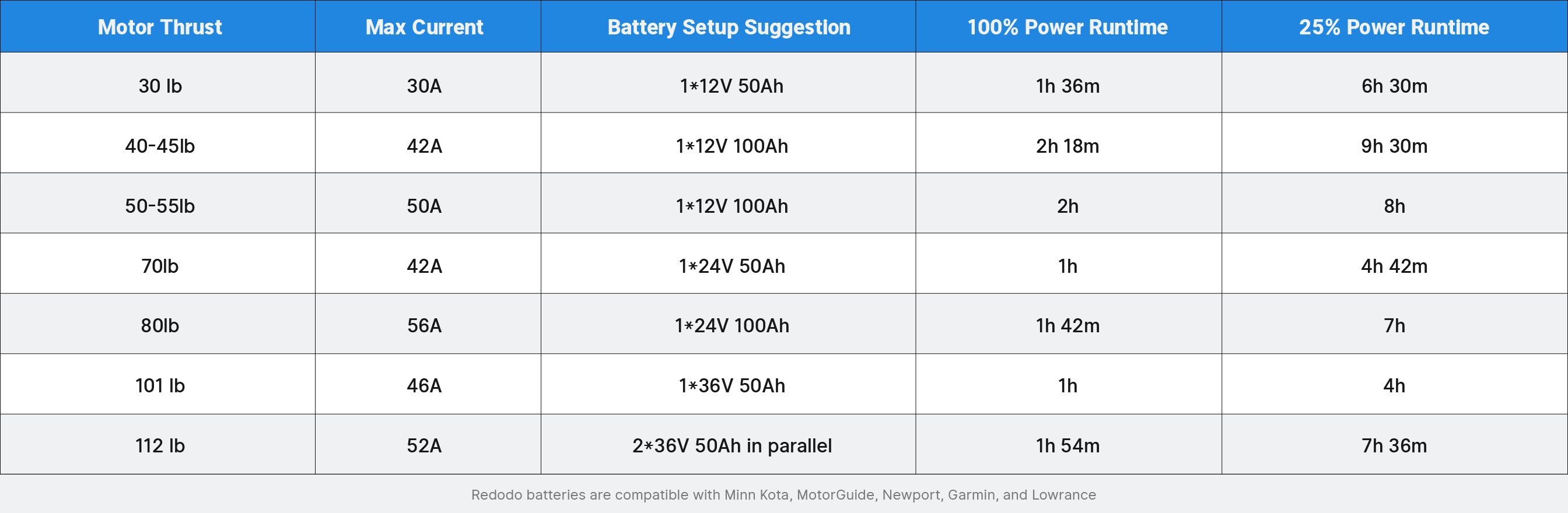 Your motor's thrust (in lbs) and voltage (12V, 24V, 36V) directly determine the minimum battery capacity and runtime you can expect. Make an informed choice and get back to fishing with confidence.