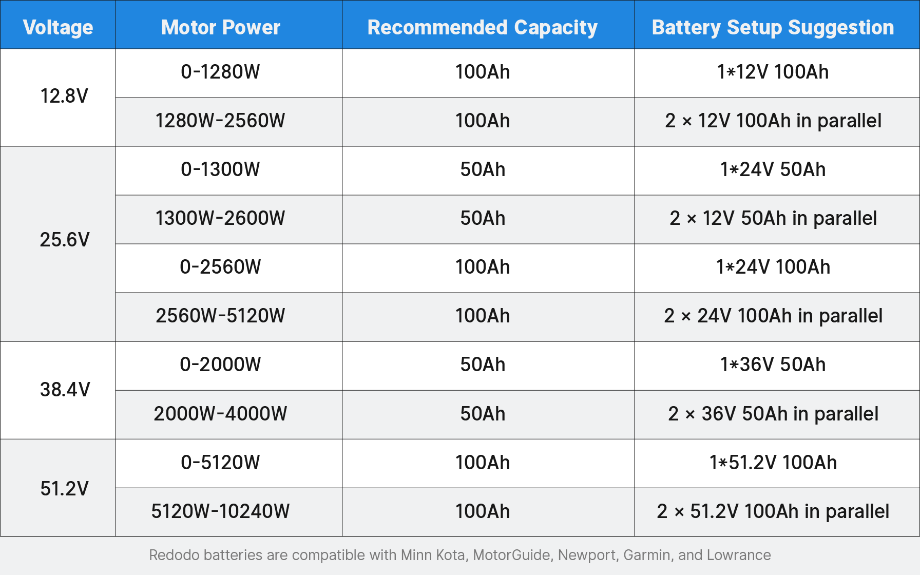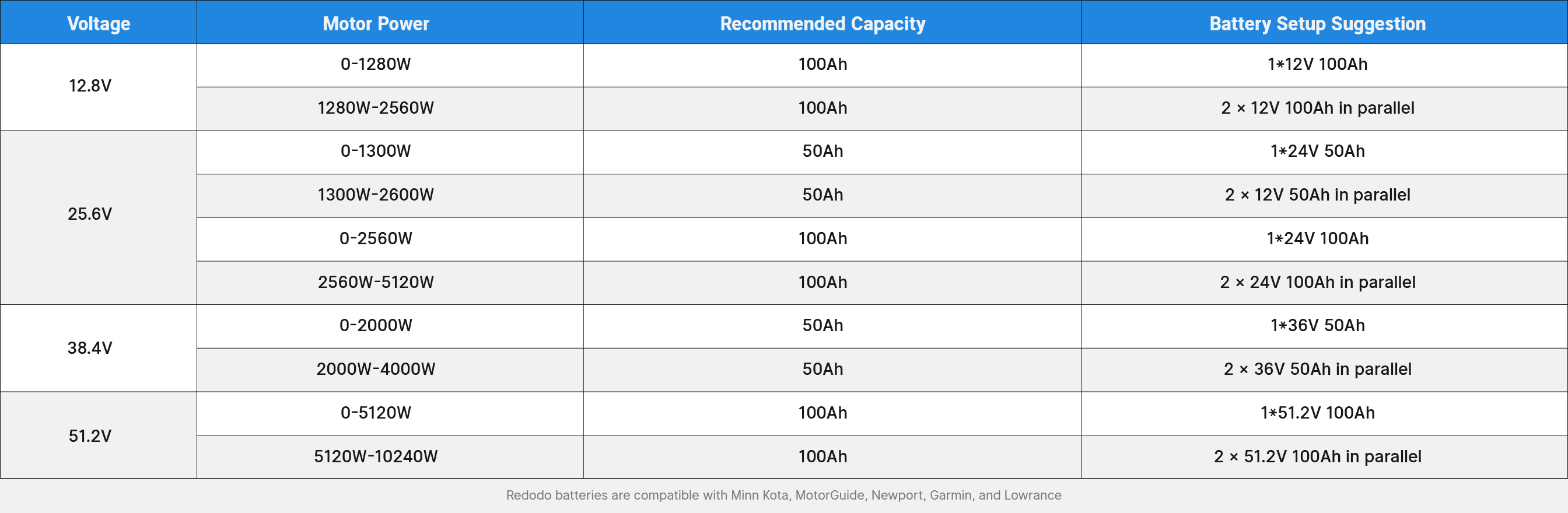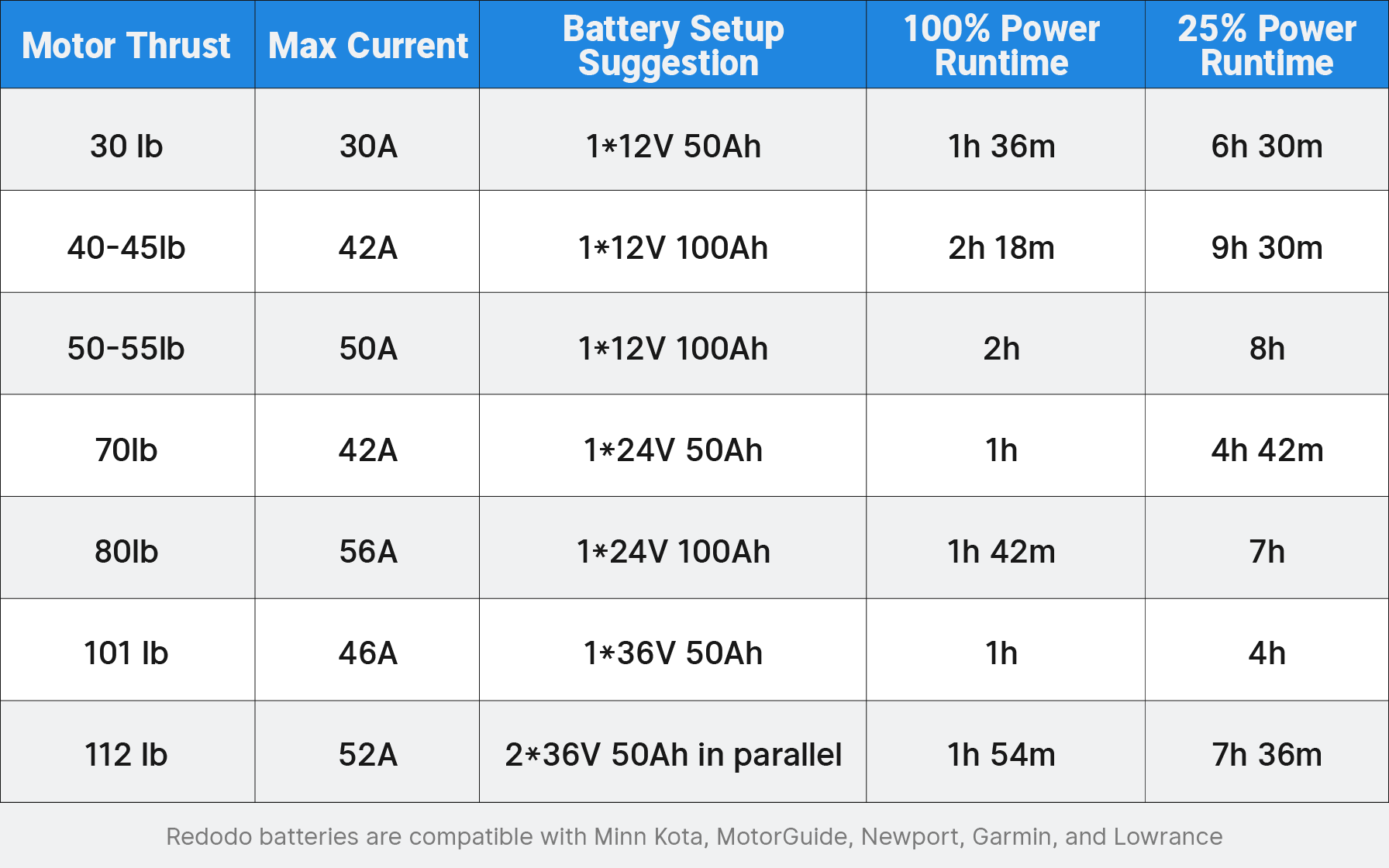 Redodo batteries are compatible with major trolling motor brands on the market, including Minn Kota, MotorGuide, Newport, Garmin, and Lowrance. Whether you’re going for a traditional battery or a modern lithium battery, check that it fits with your existing setup to avoid any issues.