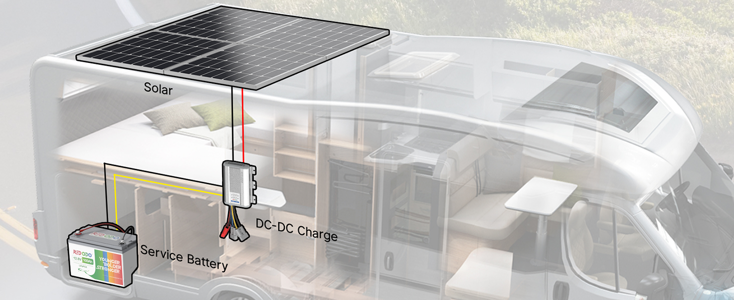 【Dual Input for 100% Charged】Redodo DC-DC battery charger is intended to charge the service battery through a starter battery or solar panels, making the service battery 100% charged more flexibly. With built-in MPPT technology, the charger is able to achieve a high charging efficiency from solar panels at a suitable voltage. The user-friendly indicators on the charger makes it possible for the user to easily know the charging status of the service battery.