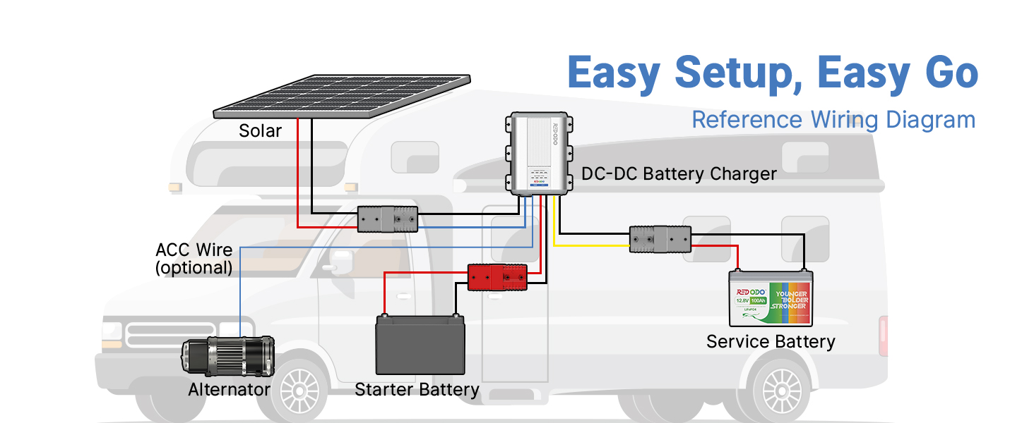 【Compact Design & Easy setup】Redodo battery charger is small and exquisite, simple to be installed. With a compact design (dimension: 5.8*1.89*7.44 inch, weight: 2.43 lbs), it occupies less room and saves more space on your vehicle, bringing more convenience and less concern during the setup. The built-in Anderson connectors makes the installation simpler and easier.